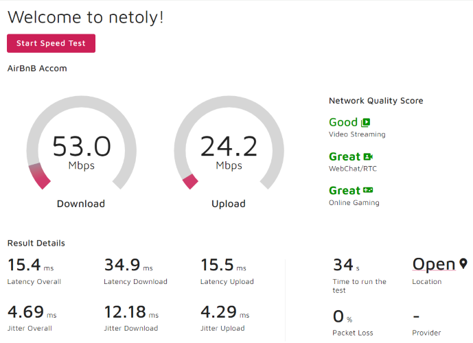 Network conditions can change, so while a positive test result is reassuring, unexpected issues like network congestion could occur during your stay—just as they might at home or work. There’s also the chance a host might use a mobile data connection or a different Wi-Fi network for the test. Netoly checks the test’s location to mitigate this, but it can’t guarantee with absolute certainty that the guest Wi-Fi was used. If discrepancies arise upon your arrival, your saved benchmark in Netoly offers a factual basis to discuss any issues with your host. Note however that Netoly can only offer a snapshot of the network in a window of time – we cannot guarantee that this will be true of the network at all times, or even in general.